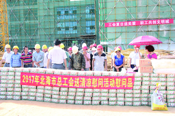 炎炎烈日,創(chuàng)新港項(xiàng)目施工現(xiàn)場(chǎng)的工人們,揮汗如雨地堅(jiān)持露天作業(yè),工人們的防暑降溫工作,牽動(dòng)著北海市總工會(huì)領(lǐng)導(dǎo)的心。8月7日下午,北海市總工會(huì)經(jīng)審會(huì)主任潘能強(qiáng)、高新區(qū)管委會(huì)副主任梁小雄等領(lǐng)導(dǎo)一行,前往北部灣海洋科技創(chuàng)新港建設(shè)工地,開展“工會(huì)夏日送關(guān)愛·職工共創(chuàng)文明城”主題活動(dòng),看望和慰問酷暑期間還堅(jiān)持奮戰(zhàn)在建設(shè)第一線的工人,為他們送去了絲絲清涼和關(guān)心。