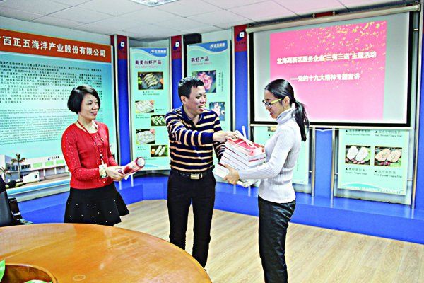 12月7日,北海高新區(qū)黨工委委員、管委會副主任傅文偉到正五海產(chǎn)公司海洋產(chǎn)業(yè)聯(lián)合黨支部開展服務企業(yè)“三有三送”主題活動——黨的十九大精神專題宣講,傳達了《中共北海市委員會關(guān)于認真學習貫徹自治區(qū)黨委彭清華書記在北海市學習宣傳貫徹黨的十九大精神座談會上的講話的通知》,向北海高新區(qū)海洋產(chǎn)業(yè)聯(lián)合黨支部贈送了書籍,為黨員們上了一堂生動的黨課。