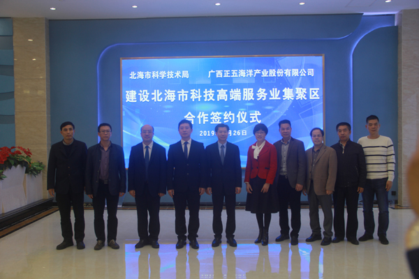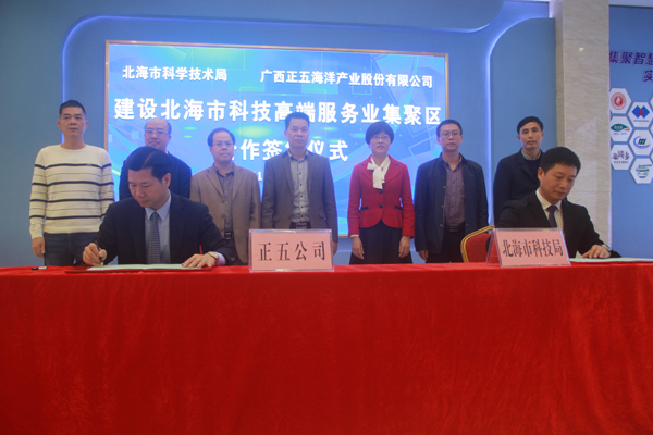 3月26日下午,北海市科學技術(shù)局與廣西正五海洋產(chǎn)業(yè)股份有限公司在正五北部灣海洋科技創(chuàng)新港一樓大廳簽訂《北海市科技高端服務業(yè)聚集區(qū)戰(zhàn)略合作協(xié)議》。參加簽約儀式的有市科技局領(lǐng)導班子成員,各科室負責人及北海市科技信息研究所干部職工、正五集團董事長黃禮雄、集團副總裁榮培彥及正五公司各部門負責人等共計30余人。